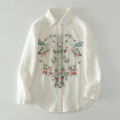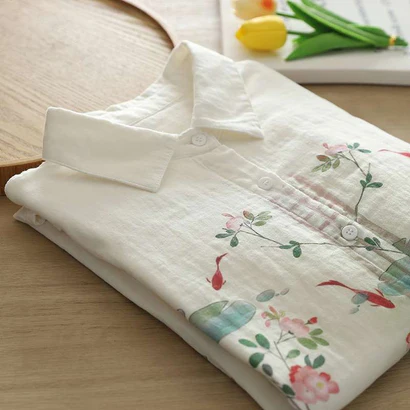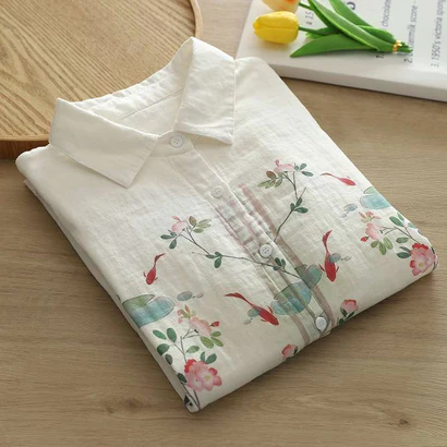 Add a refreshing charm to your wardrobe with this white cotton shirt 🌿 featuring a delicate mix of floral blooms 🌸 and koi fish prints 🐟. Designed with a classic collar 👔 and button-down style 🔘, it’s a versatile piece that blends elegance with comfort. Perfect for casual days, office wear, or weekend outings, this shirt is your go-to for effortless chic. ✨