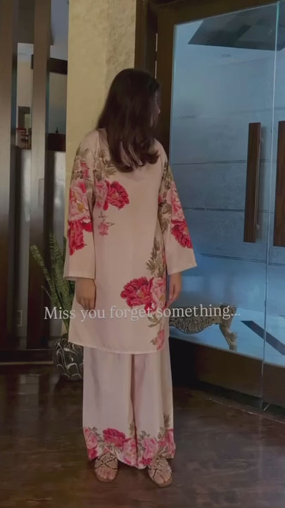 Turn everyday moments into timeless style statements with this pastel floral co-ord set. Designed in a soft blush base, the outfit is adorned with bold, painterly florals in shades of pink and green ๐ธ๐ฟ. The loose-fit silhouette with wide sleeves and flowy trousers ensures maximum comfort without compromising on elegance.